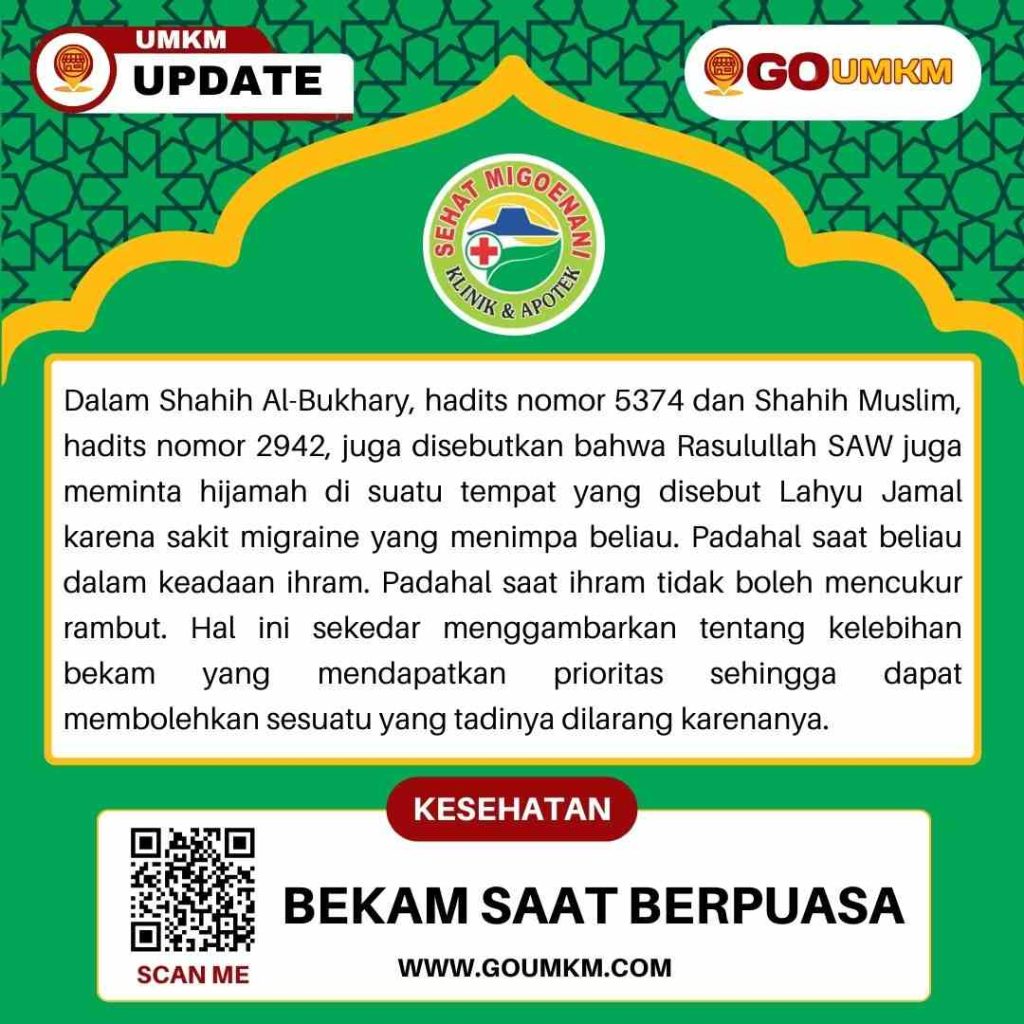 Hallo sahabat migoenani… Saat berpuasa kita diperbolehkan untuk melakukan bekam ya… Karena berdasarkan hadist yang ada bekam tidak mebatalkan puasa. Akan tetapi harus memperhatikan beberapa hal ya sahabat.. Bekam menjadi makruh jika dilakukan orang yang jelas -jelas badannya lemah, dan lebih makruh lagi jika kemudian bekam itu membatalkan puasanya, dan tidak makruh bagi orang yang […]
